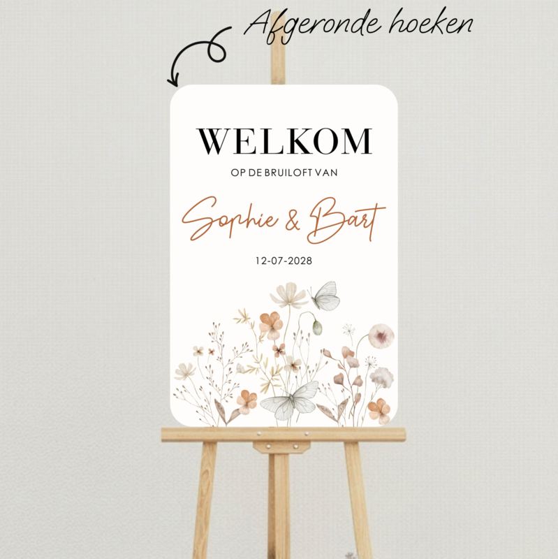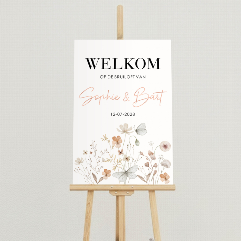 Geef jullie grote dag een warme en stijlvolle entree met dit prachtige welkomstbord bruiloft. Een romantisch ontwerp met veldbloemen in rustige natureltinten die de onderzijde van het bord sieren, terwijl jullie persoonlijke tekst elegant boven de bloemen prijkt. Tussen de bloemen vliegen twee schattige vlindertjes voor een speels en luchtig accent.