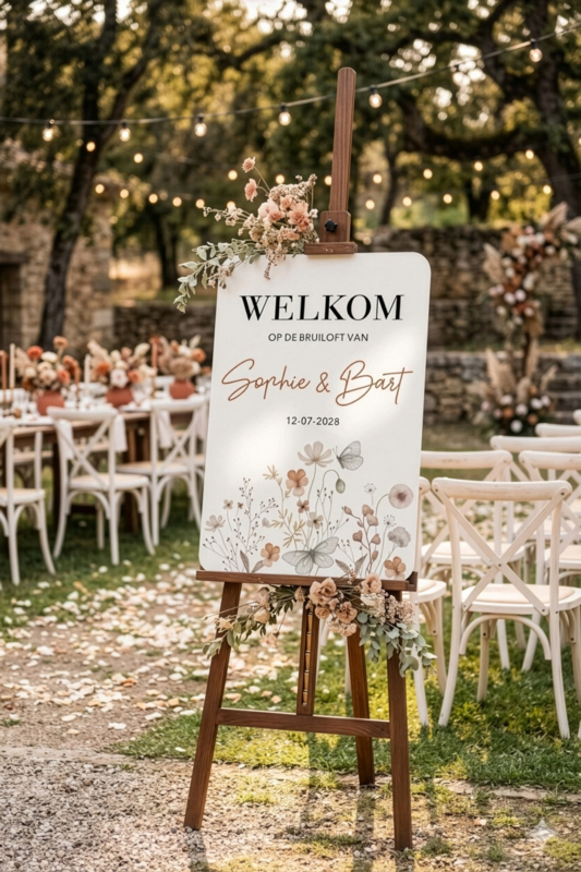 Met dit stijlvolle ontwerp uit onze collectie welkomstborden bruiloft creëren jullie direct een warme en persoonlijke sfeer bij binnenkomst. Een echte blikvanger die perfect past bij een romantische, natuurlijke trouwstijl.
