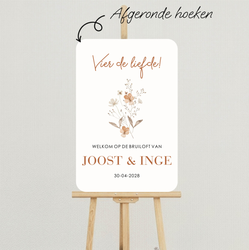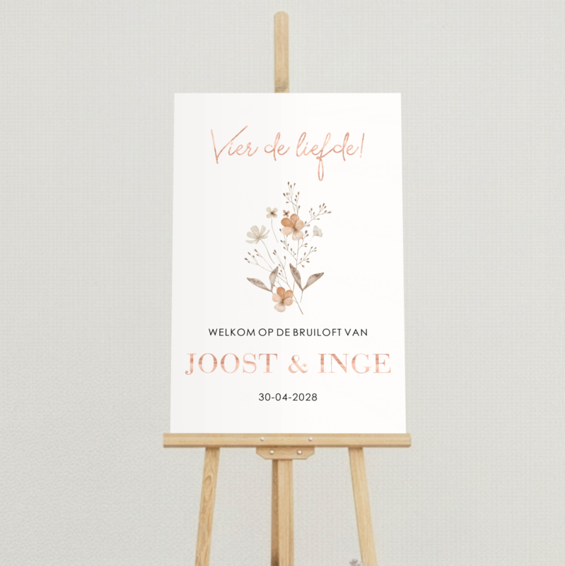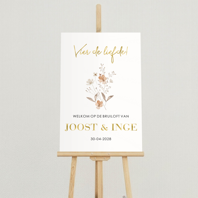 Vier jullie grote dag in stijl met dit sfeervolle welkomstbord bruiloft. Bovenaan prijkt in dezelfde kleur als de namen de vrolijke tekst “Vier de liefde!”, daaronder romantische veldbloemen in zachte natureltinten. De bloemen vormen een prachtig decor voor de rest van jullie persoonlijke tekst, die onder de bloemen staat en volledig naar wens kan worden aangepast.