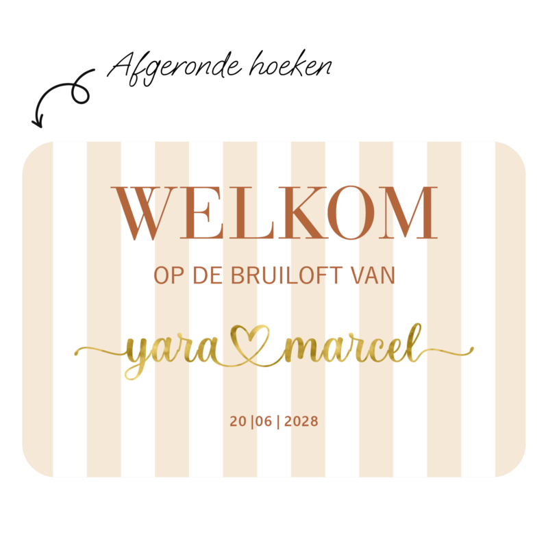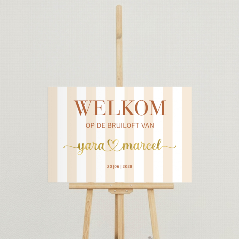 Geef jullie grote dag een warme en stijlvolle entree met dit prachtige welkomstbord bruiloft. Een modern ontwerp met verticale cremekleurige en witte strepen. De combinatie met de roestbruine tekst en de goudfolie namen maken het helemaal af.