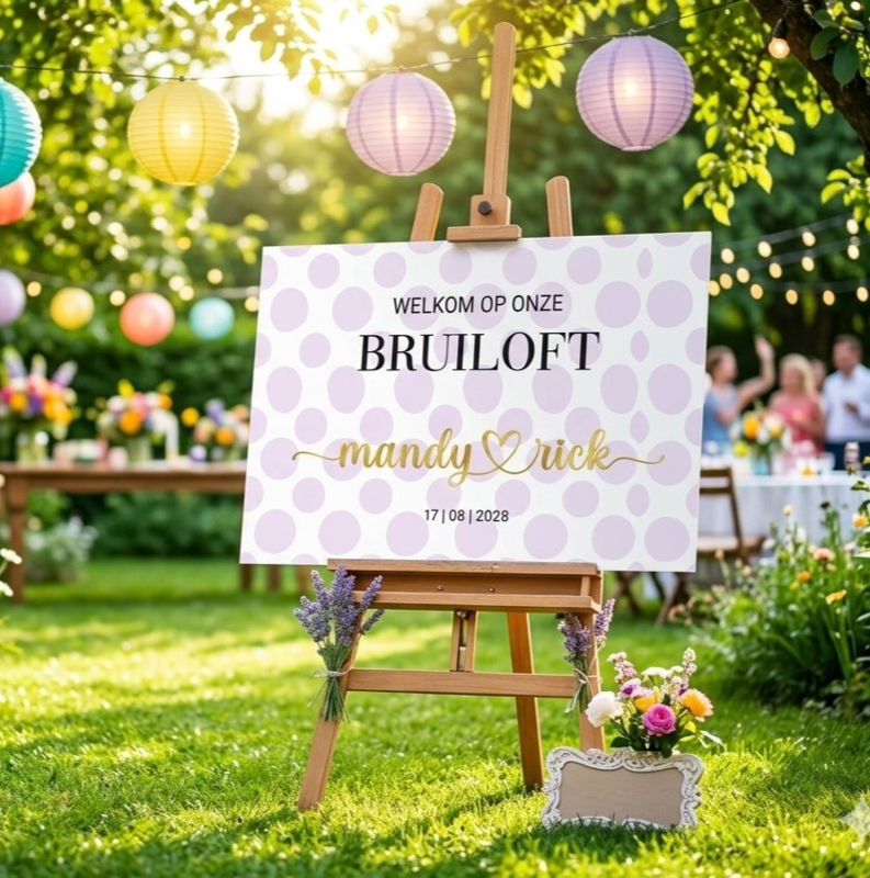 Dankzij het lichte maar stevige materiaal is het bord eenvoudig te plaatsen bij de entree van jullie ceremonie, feestlocatie of tuinbruiloft.