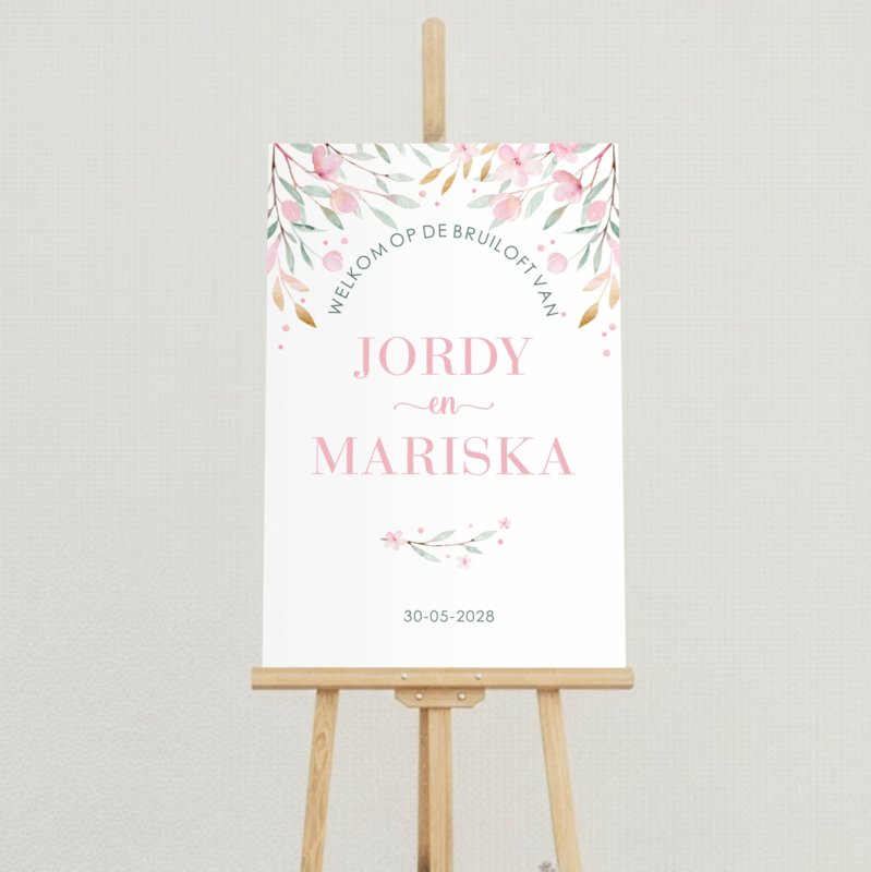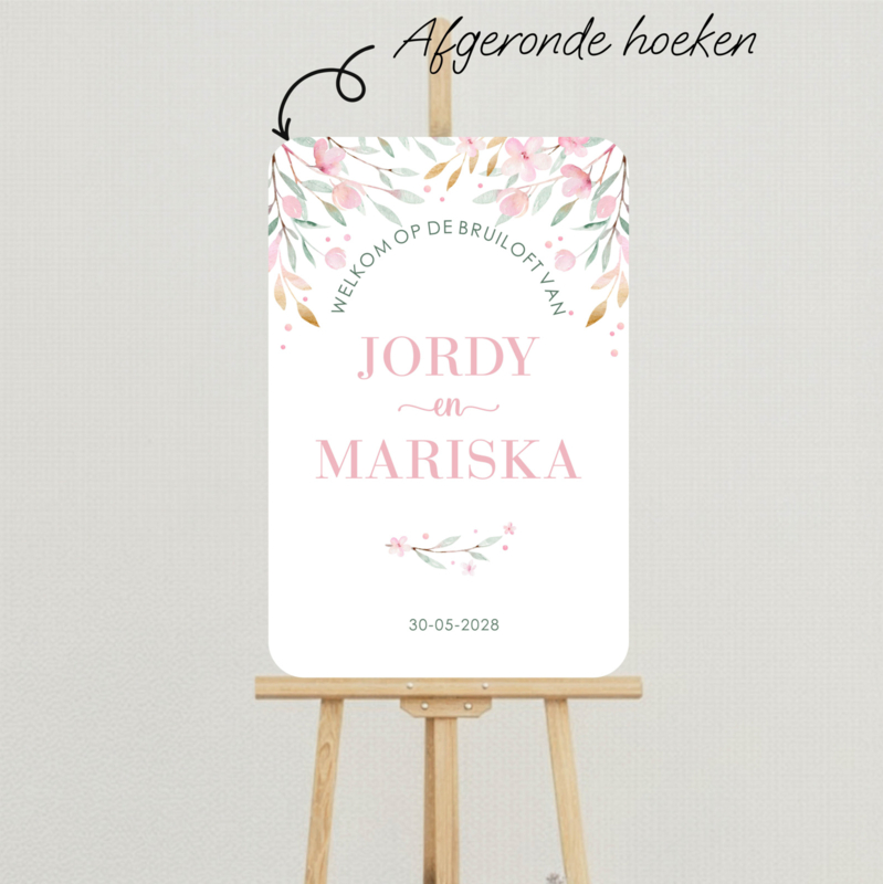Mooi, romantisch ontwerp met bloemen aan de bovenzijde van het welkomstbord. De welkomsttekst staat onder de bloemen in een ronde boog. Daaronder de namen en de trouwdatum. Je kunt kiezen om de namen in de standdaardkleur (babyroze) of in goudfolie te laten drukken.