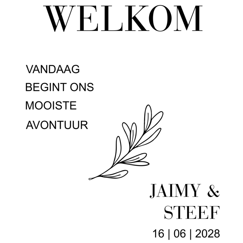 Sticker welkomstbord bruiloft 'Mooiste avontuur'.
