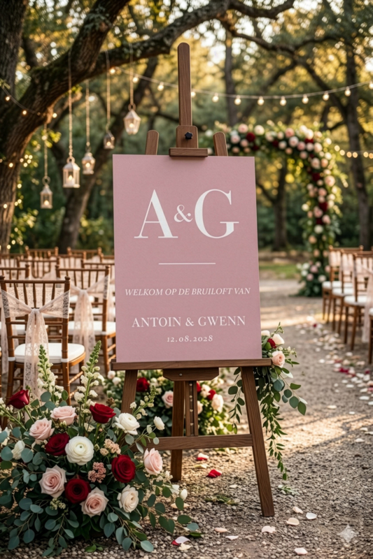 Dankzij het lichte maar stevige materiaal is het bord eenvoudig te plaatsen bij de entree van jullie ceremonie, feestlocatie of tuinbruiloft.