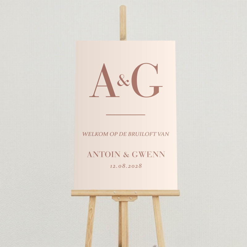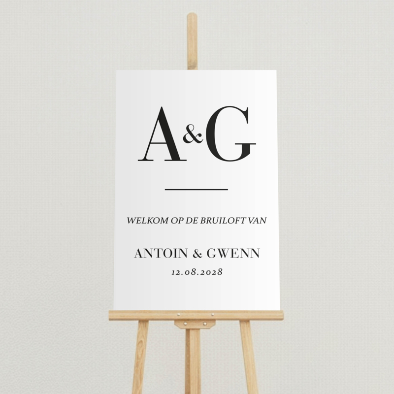 Houden jullie van strak en modern? Dan past dit stijlvolle Bruiloft Welkomstbord zeker bij jullie. Bovenaan staan jullie initialen in het groot en daaronder de welkomsttekst met jullie namen en trouwdatum.