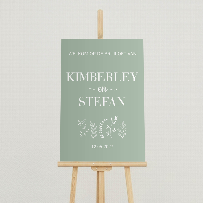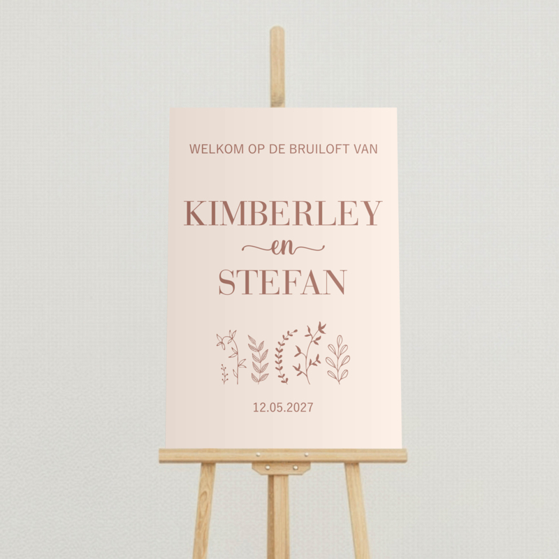 Dit welkomstbord is volledig te personaliseren. Jullie gewenste tekst kunnen jullie eenvoudig invullen in de daarvoor bestemde vakken. Denk aan jullie namen, trouwdatum, locatie of een mooie welkomstzin voor jullie gasten.