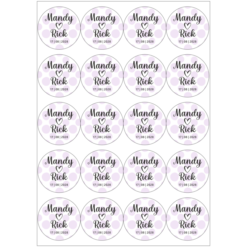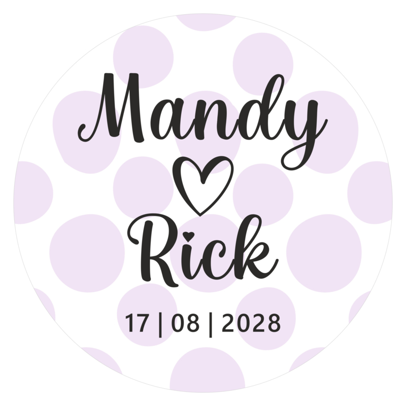De etiketten zijn versierd met lila stippen en bedrukt met jullie namen en trouwdatum. Dit geeft de stickers een vrolijke en liefdevolle uitstraling die perfect past bij een zonnige bruiloft.