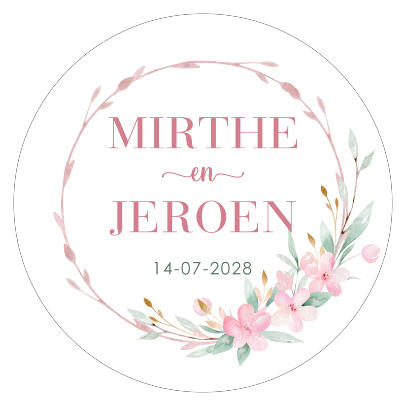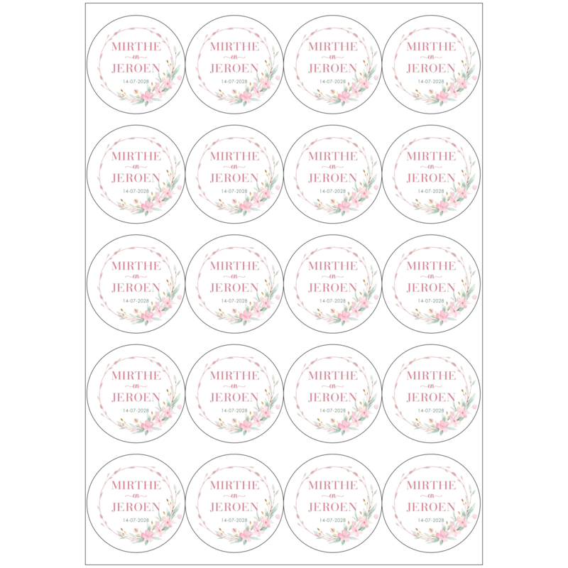 De etiketten zijn versierd met een krans van roze bloemen en bedrukt met jullie namen en trouwdatum. Dit geeft de stickers een stijlvolle uitstraling die perfect past bij een romantische bruiloft.