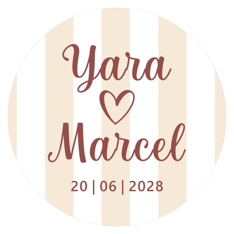 De etiketten zijn versierd met crèmekleurige strepen en bedrukt met jullie namen en trouwdatum in een roestbruine kleur. Dit geeft de stickers een trendy uitstraling die perfect past bij een romantische bruiloft.